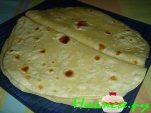 После незначительной расстойки тесто разрезать на куски весом 75 г, которые раскатать на тонкие лепешки и выпекать на раскаленной сухой сковороде до румяной корочки.