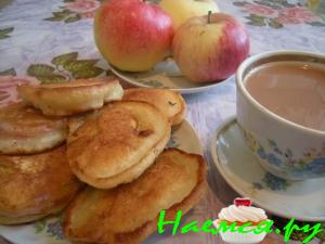 Разогреваем сковороду и начинаем выкладывать оладушки,а сверху кладём натёртые яблоки(см.фото),когда одна сторона поджарится,мы переворачиваем оладушки на другую сторону и жарим до золотистого цвета.