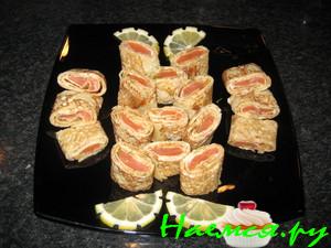 В блины завернуть начинку,сложить в огнеупорную форму,сверху посыпать сыром и поставить в разогретую до 180 градусов духовку на 10 минут.