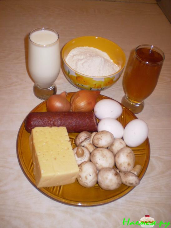 1.Мелко режим лук и подрумяниваем. Добавляем мелко порезанные грибы и колбаску. Обжариваем все вместе на растительном масле. Оставляем остывать.