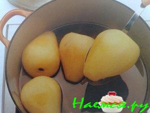Затем груши выловить и отложить на время.Вино уварить на небольшом огне до густоты легкого сиропа.Процедить через сито сироп на груши,накрыть тарелкой и остудить.Убрать в холодильник на 5 часов (на ночь).
