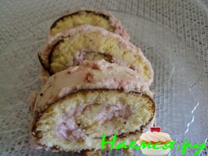 Аккуратно развернуть бисквитный пласт.Смазать клубничным кремом,оставив свободные края,и вновь свернуть рулетом.Рулет положить на блюдо и украсить.