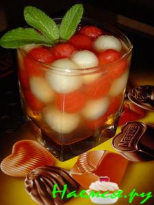 Начнем приготовление "фруктовой сказки" с вырезания шариков из дыни и арбуза с помощью ложки-нуазетки (или нарезаем кубиками).