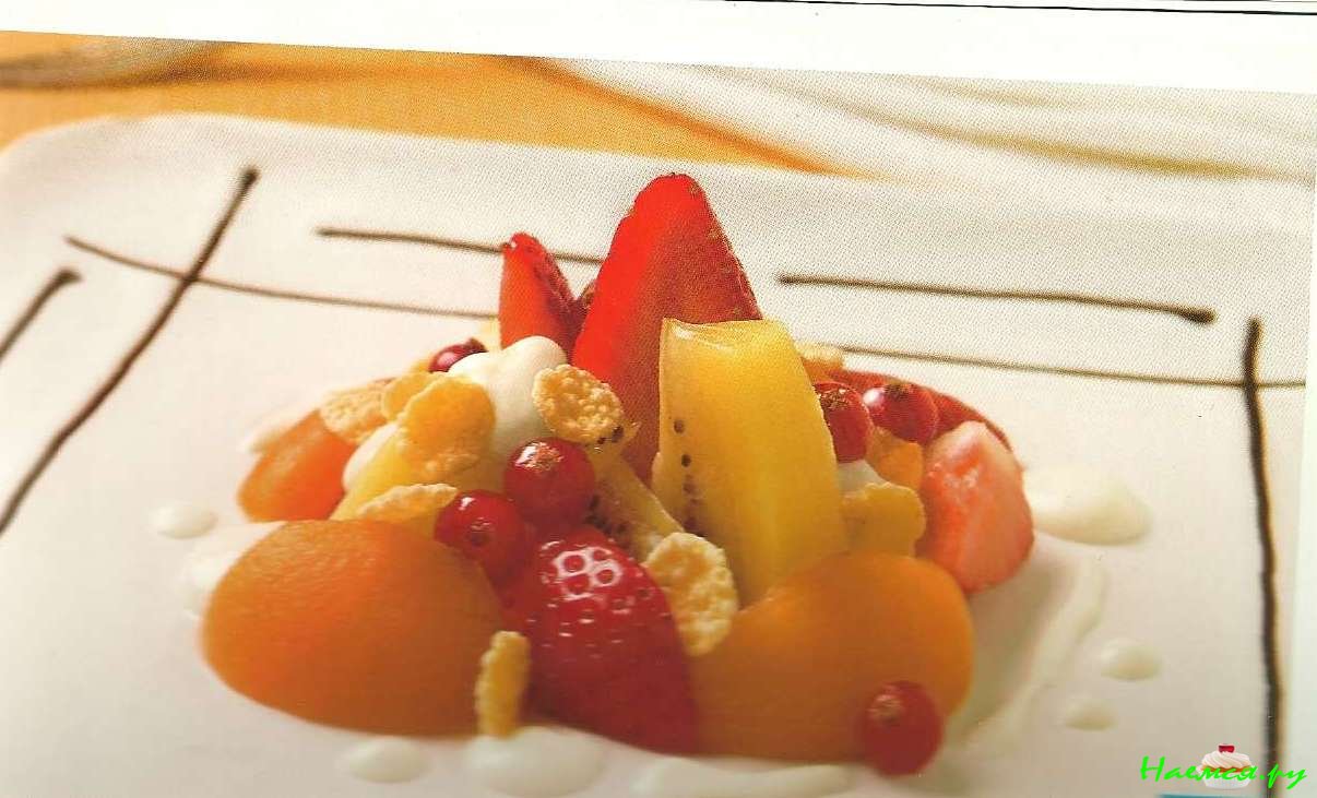 4) На блюдо выложите смородину, клубнику, киви и абрикосы