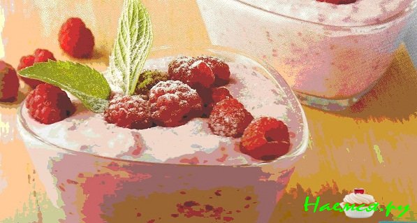 1) Творог взбейте миксером до кремообразной консистенции, добавьте сметану, сахар и взбивайте ещё минуту. Положите малину и взбивайте всё вместе ещё 30-50 секунд