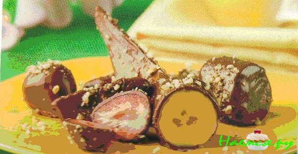 3) Пока шоколад на фруктах не застыл, можно посыпать его измельчёнными орехами или вафлями