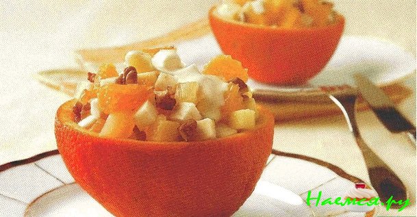4) Выложите салат в апельсиновые корзиночки, посыпьте оставшимися орехами