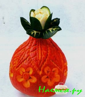 18. Нанизать цветы на шпажки и поставить в вазу из дыни, украсив листиками мяты. Можно также выложить цветы и листочки на блюдо.
