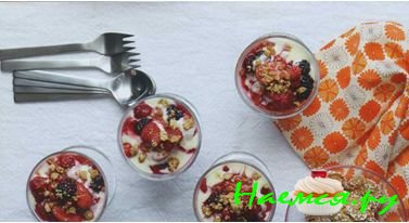 ► Смешайте йогурт с медом и добавьте % ягод. Разложите по порционным чашкам или формочкам и до подачи уберите в холодильник.