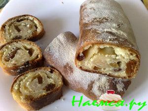 Груши предварительно очистить от кожицы, удалить семена и тонко нарезать. На край теста выложить сначала тонко порезанные груши, затем буше.