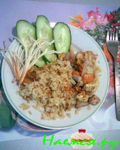 Все перемешиваем, всыпаем рис (где-то стакан-полтора), заливаем водой (1:2), закрываем крышку (я обворачиваю полотенцем, чтобы пар не выходил наружу), томим на маленьком огне до готовности