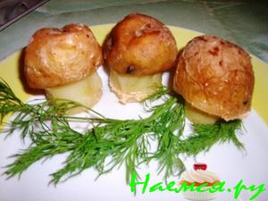 Ложем на противень,смазываем грибочки постным маслом,солим и в духовку.
