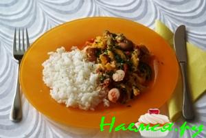 Нарезаем кубиками цукини, добавляем к баклажанам, продолжаем тушить, помешивая.