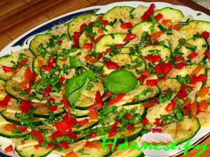 Порезать помидор и перец мелкими кусочками .Выложить на цуккини и ещё на 20 мин в духовку.