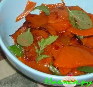 В сковороде разогреть растительное масло и в нём обжарить в течение 5 минут нарезанную тыкву.