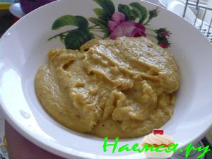 Доводим соус до кипения,солим по вкусу. Готовый соус выкладываем на гороховое пюре непосредственно в порционной тарелке.Я ещё курочку зажарила в "рукаве" и подала с таким вот гарниром.Мои мужчины были очень сыты и довольны!