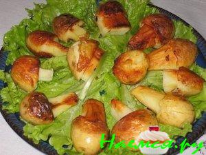 С одной стороны каждой картофелины делаем надрез (неглубокий) по кругу, обозначив таким образом шляпку гриба.