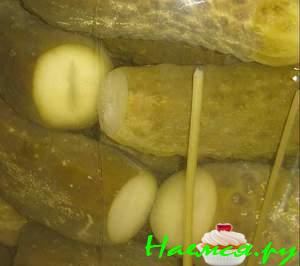 Затем этим же рассолом 3 раза заливаем огурцы. На 3-й раз крутим, переворачиваем и укутываем.