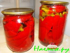 Перец вымыть, очистить от семян, нарезать полосками шириной 1 см. Приготовить маринад с добавлением сахара, соли, подсолнечного масла, довести до кипения, опустить нашинкованный перец в маринад, поварить на слабом огне 5 минут, добавить столовый уксус. В стерилизованные банки положить на дно 1 горошину перца и маленький острый перчик.