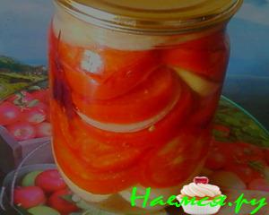 Плотные, зрелые, крепкие томаты вымыть и сложить в стерилизованные банки, залить горячим томатным соком, а точнее массой (для этого протереть через сито оставшиеся помидоры). У меня эл. мясорубка со специальной насадкой для томатов, поэтому получается все очень быстро. При кипячении сока добавляю на каждый литр жидкости по 1 ч. лож. соли и сахара, но можно оставить и чистый сок. Банки стерилизовать 20 мин.