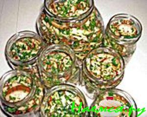 На дно банки укладываем слой баклажан,затем посыпаем этот слой нашими приправами,потом опять слой баклажан,слой приправ и так до конца.