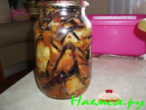 Сладкий перец, горький перец, укроп, петрушку, чеснок – перекручиваем на мясорубке или в комбайне, добавляем 700мл. масла и 200мл уксуса, перемешиваем с вареными баклажанами. Складываем в стерилизованные банки, стерилизуем 20 минут.