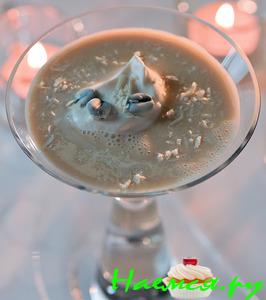 Сверху выложите ложкой немножко взбитых сливок, посыпьте апельсиновыми цукатами и тертым белым шоколадом.