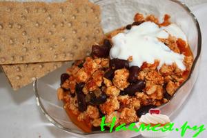 Репчатый лук нарезать и обжарить.Нарезанные перцы смешать с луком и протушить. Добавить говяжий фарш. Добавить васаби, все специи. Добавить томатную пасту и кофе. Немного протушить.Перелить все в кастрюлю. Добавить бульон, консервированые томаты, чеснок, охотничьи колбаски.