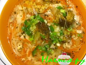 3) Небольшая хитрость в кулинарии: отлейте один стаканчик куриного бульона и оставьте его остывать, а пять стаканов данного бульона налейте в кастрюлю, добавив туда же куриное мясо, пожаренные овощи, почищенные креветки и сосиски, которые, кстати, лучше нарезать на тонкие кружечки. Данную аппетитную массу доведите до закипания, затем на слабом огне проварите еще минуток пять и можно добавлять специи на ваш вкус и выбор.