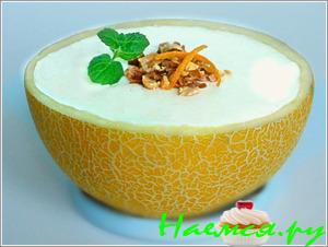 Разрежьте дыню и удалите косточки.Мякоть нарезать кусочками и положить в блендер, туда же добавить сок 1 апельсина и взбить пюре.По вкусу добавить сахар.Подавать суп с шариком мороженного и кукурузными хлопьями.
