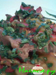 1) Нарезать не большими кусочками мясо и обжарить их с растительным маслом, при сильном огне. Следом положить мелкопорезанный лук, нарезанную ломтиками морковь, сладкий перец – все пожарить, посолить, положить хмели-сунели, барбариса, и потушить 20 мин.
