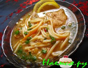 Жареное утиное мясо с луком и морковью, поместить в кипящий бульон. Далее добавить лапшу Удон и варить до готовности лапши.