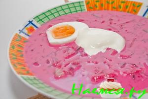 Закипятить водичку, открыть баночку бурачков, содержимое банки аккуратно (чтобы не запачкаться бурачным соком, а то потом можете и не отстирать((()))))) вытряхнуть)))) в кастрюлю с водой. Отправить кастрюлю остужаться куда-нить, обычно я это делаю так: в ванну набираю холодную воду и ставлю в нее кастрюльку, пока будет резать огурцы и зелень, варить яйца, чистить и тоже резать - кастрюлька должна охладиться))))))). В кастрюлю добавить огурцы, зелень, кефир, сметану, соль и уксус по вкусу. Яйца добавляете как нравится: или вместе с огурцами или перед подачей - как в оригинальном рецепте.