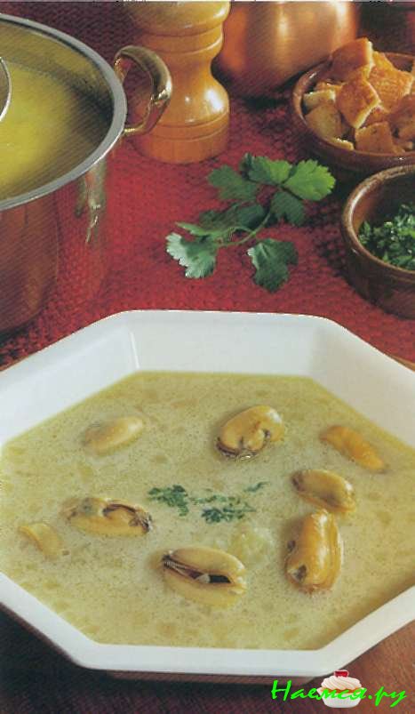 Растопите масло в большой кастрюле. Обжаривайте нарезанный лук 2 минуты. Залейте лук белым вином, затем добавьте мидии. Накройте кастрюлю крышкой и прибавьте огонь. Когда мидии полностью раскроются, вытащите их из кастрюли и просушите. Процедите сок и отделите три четверти мидий от ракушек. Доведите рыбное заливное до кипения, убавьте огонь наполовину. Добавьте сливки, процеженный устричный сок и снова убавьте огонь. Поперчите и посолите, только аккуратно - заливное само по себе достаточно соленое. Часть супа перелейте в небольшую миску. Рыбу нарежьте кусочками толщиной 2 см, положите в суп и варите примерно 5 минут. Добавьте очищенные от ракушек устрицы и те, что остались в панцире. Снимите суп с плиты. Желток смешайте с перелитым в отдельную миску супом и полученную смесь добавьте к основной массе. Аккуратно помешайте. Теперь настал черед креветок и заранее нарезанной петрушки: добавьте их в суп - и можно подавать!