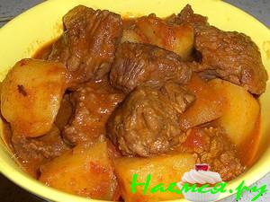 - Чеснок смешиваем с луком, обжариваем вместе 3 минуты, добавляем говядин, закрываем крышкой и тушим до 10 минут.