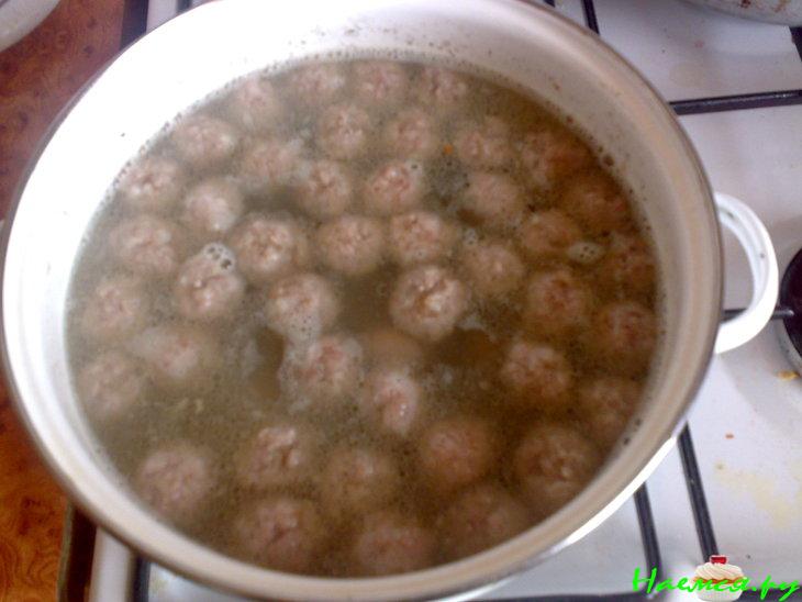 Далее...На 35 минуте варки фасоли в супчик кладем приготовленные из фарша фрикадельки,картофель,даем им повариться 10 минут и кладем наши шишечки, супчик со всеми волшебными дополнениями варим еще 7-10 мин.Солить супчик можно после того,как немного поваратся фрикадельки,тогда же перчим,кладем лавровый лист,головку лука...Чеснок я отправляю ко всей этой честной компании за 1-2 минуты до окончания всего термического процесса...Накрываем наш супчик крышкой и даем ему опомниться и свыкнуться с неизбежным 5 минут, а затем уже можно пробовать и не только...