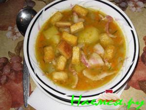 Когда горох настоялся варим его в подсоленной воде 15 мин, снимая пену, затем добавим порезанную картошку, и еще варить 5 мин, а затем положим туда зажарку, лавровый лист,перец чесночный на кончике ножа,щепотку зелени для супа,и специи по вкусу и варим еще 5 мин.