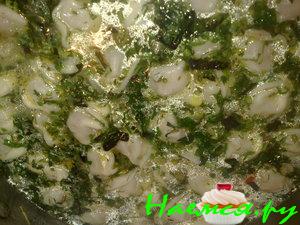 Лук меленько порубить и тоже в суп.