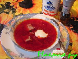 Говядину нарезаем (желательно с косточкой) и ставим варится ,пока мясо вариться капусту тушим с консервированными помидорами ,куда добавляем нарезанную картошку и продолжаем тушить....Затем к тушёной капусте добавляем мясо с бульоном,продолжаем варить до полной готовности ..мин 5-8 до снятии добавляем нарезанную ,а лучше протёртую на крупной тёрке сваренную свеклу(ранее не добавили что бы не потерять яркость).Оставляем томится мин 10 ,и подаём посыпав петрушкой.По желанию можно подать майoнез или сметану