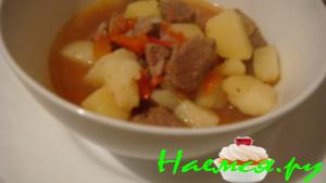 3) Нарезанное кубиками мясо добавить к смеси из лука, посолить, добавить тмин(пол ложки), добавить 1 стакан воды и тушить всё на медленном огне примерно в течении получаса.