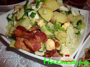 2) Бекон нарезать маленькими полосками. Мелко нашинкованный лук обжарить до золотистой корочки на растительном масле. Положить к луку бекон.