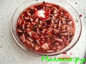 Щавель и шпинат промыть. Щавель порезать. Положить в кастрюлю, залить 2 - 2,5 литра воды. Добавить соль по вкусу, сахар. Поставить варить. После того, как закипит, снять пену, добавить хрен и варить 5-7 минут. Процедить отвар через дуршлаг и продавить в него щавель и шпинат. Снова поставить на огонь, довести до кипения и добавить агар-агар, постоянно помешивая, так, чтобы получить консистенцию очень жидкого киселя. Главное, не переборщить, а то будет желе, впрочем это тоже вкусно. Как только агар-агар растворится, выключить огонь. Охладить до теплого состояния.
