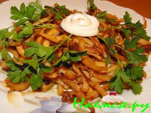 - Лук чистим, режем соломкой, складываем в ёмкость, добавляем 1 чайную ложку сахара, 0,5 ч.л. соли, 1/4 ч.л. лимонной кислоты, перемешиваем и оставляем на час, полтора.