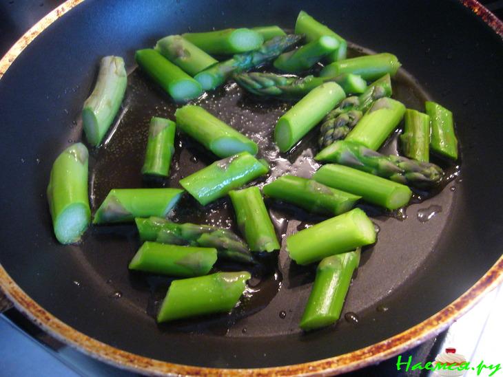 Спаржу помыть, обрезать подсохшие концы. Зеленая спаржа нежная и ее чистить, так как белую нет необходимости. Спаржу порезать наискосок, на кусочки около 2 см. В сковороде нагреть 4 ст.л. оливкового масла. Спаржу потушить около 6-7 минут в оливковом масле( спаржа должна быть слегка хрустящей) и вынуть. В сковороду положить морской коктейль и жарить около 4-5 минут на сильном огне при постоянном помешивании.