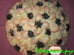 верху салат намазать майонезом, украсить хвостиками креветок. Так же украсить икрой по вашему желанию.Салату дать хорошо настояться.