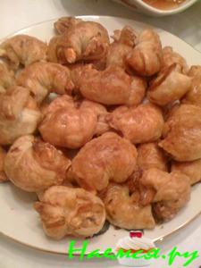 Креветки очистить и замариновать в смеси сока лимона, масла и специй. Филе пропустить через мясорубку, добавить рис, специи, соевый соус, яйцо и приправы. вымесить фарш. Сформировать небольшие котлетки-тефтельки. Выложить на смазанный противень. На каждую положить по креветке. Сверху выложить по кусочку сыра. Запекать в духовке до готовности.