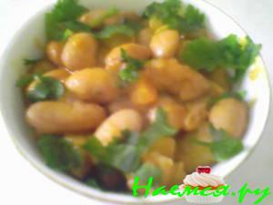 В сковородке обжариваем нарезанный лук, добавляем сельдерей, перец, чеснок, вино и специи, тушим до готовности. Можно добавить бульон, если мало жидкости, добавить фасоль и, в конце - нарезанный кусочками лосось. Закрыть крышкой, протушить, и - готово!