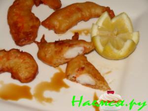 Нагреваем масло для фритюра и опускаем в него креветки в кляре маленькими порциями, обжаривая до корочки.