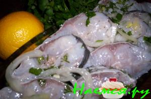 ---2.через 3часа смыть соль,залить рыбу маринадом,пересыпать базеликом и луком ,мариновать 24часа