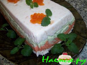 Пока идет процесс застывания креветок в желе, ввести оставшийся желатин в рыбно-сырную массу. Затем выложить на креветки, закрыть свободными концами пленки и оставить в холодильнике часа на 2-3.